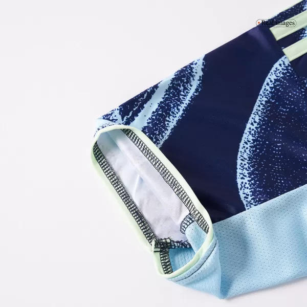 The Ajax Away Soccer Jersey 2025/26 celebrates Amsterdam’s heritage as a breeding ground for football talent. Inspired by the city’s spirit and culture, this design reflects the belief that talent is “in our water.” The dark “Night Sky” base is elevated with dynamic, wavy graphics in lighter blue, giving the shirt a unique marbled effect. Adidas adds a fresh touch with fluo green logos and sky-blue details, creating a modern look that stands out both on and off the pitch.For the first time, the jersey showcases a monochrome Ajax crest, a bold reinterpretation of tradition. Completing the kit are matching shorts and socks, keeping the look sharp and unified.