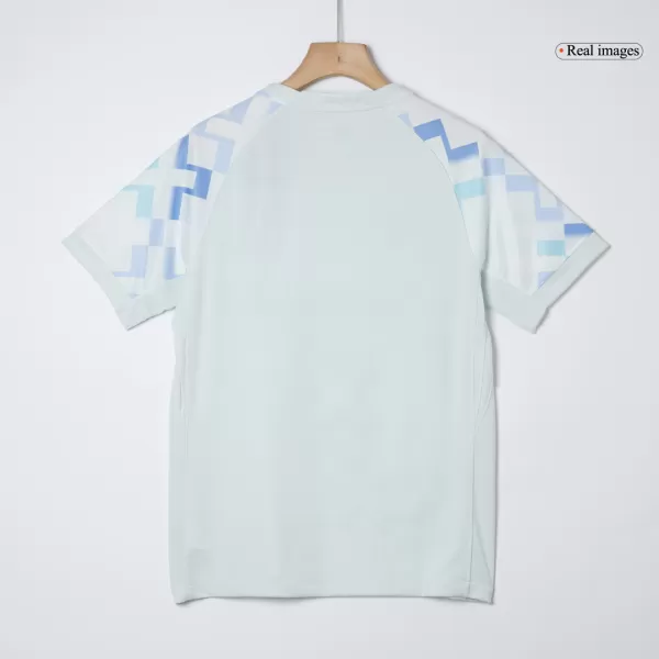 TheInter Milan away soccer jersey 2025/26introduces a unique design that celebrates both the spirit of craftsmanship and the upcoming 2026 Winter Olympics. Inspired by woven textiles, the kit’s interlocking pattern symbolizes community and collective strength. Its all-over blue and turquoise snowflake-like design pays homage to Milan and Cortina, the hosts of the Winter Games. A message inside the collar reads”Brothers + Sisters of the World”, emphasizing unity through football.