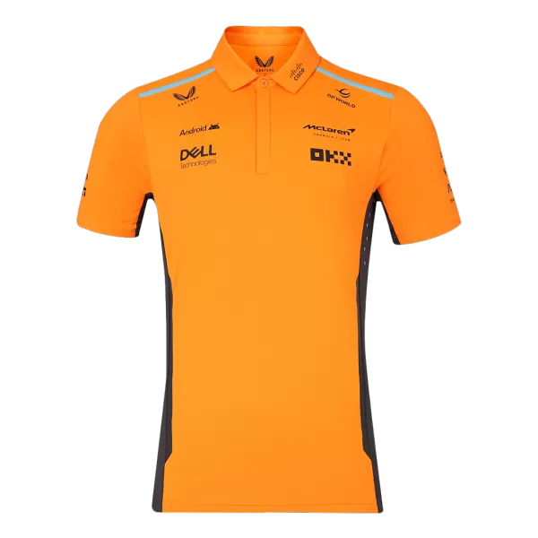 McLaren F1 Racing Team Polo 2024 – Orange OUT NOW!  The official McLaren F1 Racing Team polo catches everyone’s eye with its bright orange colour.  In particular, there’s a striking McLaren-coloured lace-up on the shoulders and waist of McLaren F1 Racing Team polo 2024, and the designers have paid homage to your beloved McLaren F1 team with this one element. The classic fit on this McLaren F1 Racing Team polo ensures you look as good as you feel – while the ribbed collar with stripe detailing provides a clean finish.  This official 2024 McLaren Formula 1 Team polo shirt from Castore will be worn by the team and drivers Lando and Oscar during the 2025 Formula 1 season.  Let’s look forward to a great new season for more surprise!